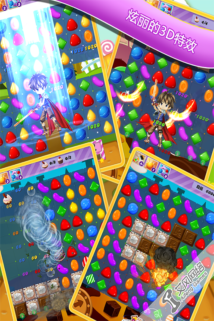 《炸弹糖BOBCANDY 2》全新布局关卡类型有最底分数、消除障碍物、限时和收集物,每个关卡都设有一个目标分数,游戏时必须把3个及以上相同的糖果连成直线,糖果马上消除。